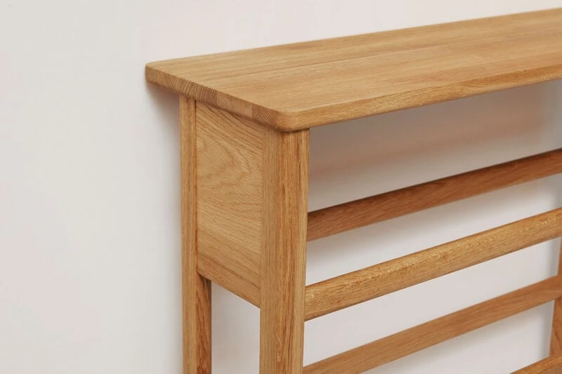 Form & Refinen A Line -sarjan kenkätelineellä on kauniit tammipuiset kehykset ja kaksi tukevaa jalkaa, joiden avulla telineen voi asettaa nojaamaan seinää vasten. Kenkäteline mahtuu kapeallekin eteiskäytävälle, ja sen neljä kenkähyllyä tarjoavat tilaa yhteensä noin 12 kenkäparille. Kenkätelineen ylätaso toimii kätevänä pikkupöytänä eteisen tavaroille.