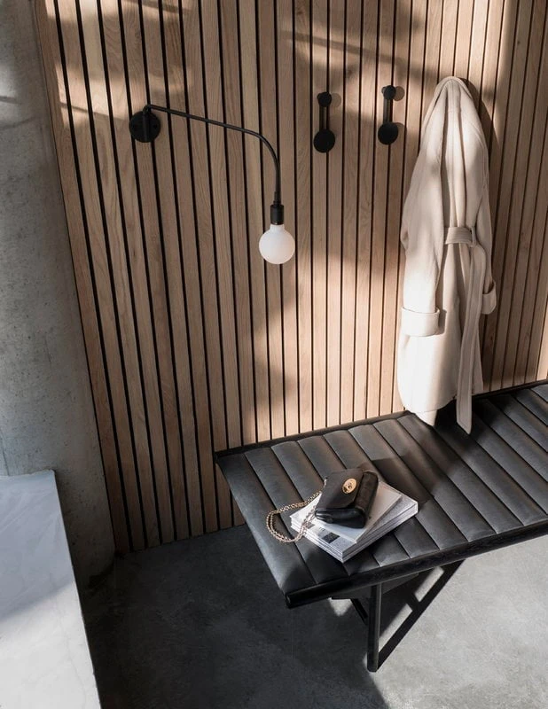 Menun Afteroom-seinänaulakko leikittelee hurmaavasti yksinkertaisilla geometrisilla muodoilla. Minimalistinen Afteroom-seinänaulakko on helppo asentaa paikoilleen, ja se sopii täydellisesti takkien, vaatteiden, laukkujen ja hattujen säilytykseen. Metallisen naulakon on suunnitellut Tukholmassa toimiva suunnittelijaduo Afteroom.