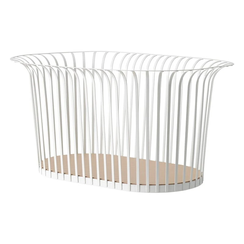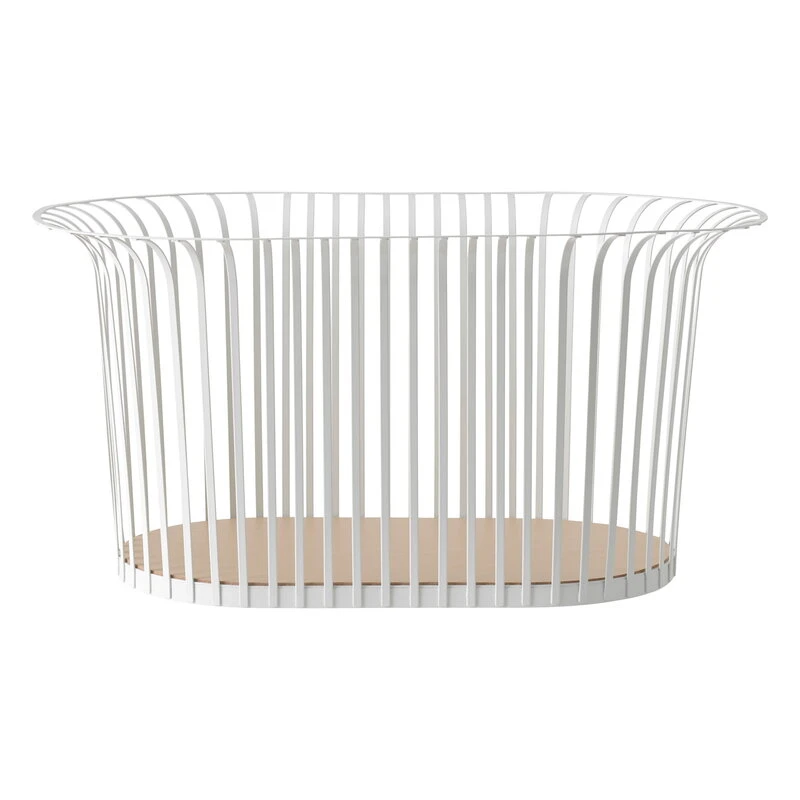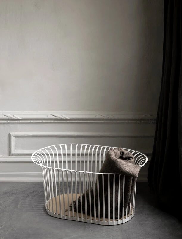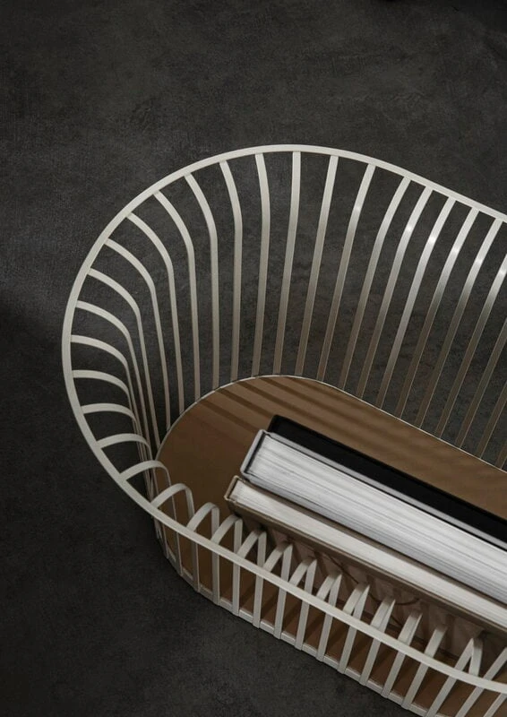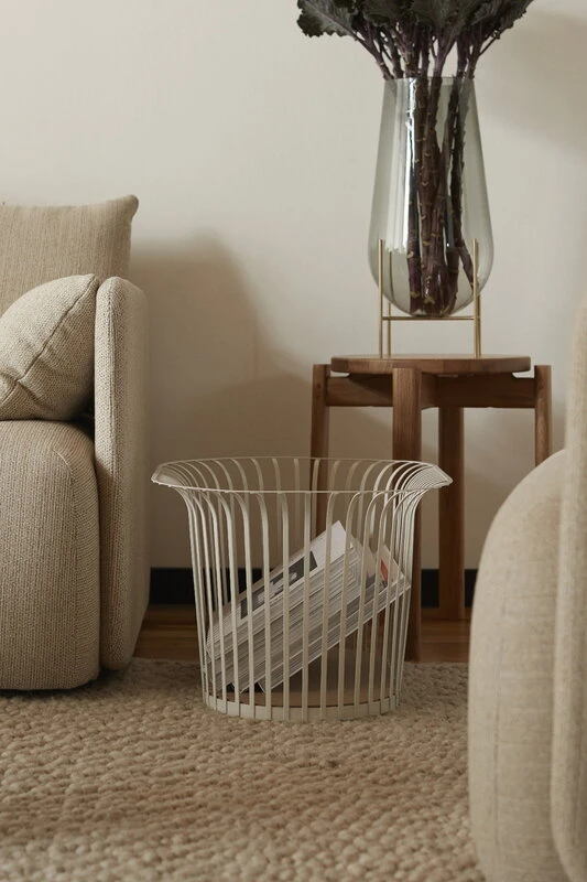 Menun Ribbon-kori on kiehtovalla tavalla sekä moderni että perinteinen: jauhemaalatusta teräksestä valmistettu kori muodostuu ohuista metalliliuskoista sekä pohjalle asetetusta, ylellistä tuntua tuovasta nahkasomisteesta. Metallikorin yläosa on muotoiltu pehmeän kaarevaksi niin, että se tarjoaa miellyttävän otteen koria siirreltäessä. Norm Architectsin suunnittelema säilytyskori on viimeistelty silikonipohjalla, joka pitää korin tukevasti paikoillaan ja suojaa samalla lattiapintaa.