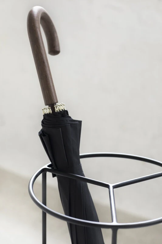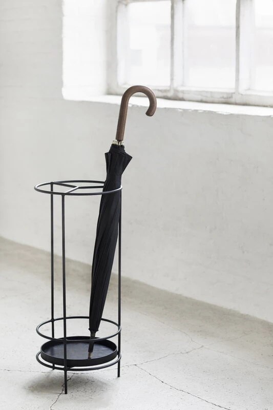Teräksestä valmistettu sateenvarjoteline on ilmeeltään samanaikaisesti veistoksellinen ja viehättävän kevyt, ja nokkelat yksityiskohdat, kuten kolmeen osioon jaettu runko ja irtopisarat keräävä irrotettava tarjotin kumimatolla tekevät siitä funktionaalisen lisän eteisen sisustukseen.