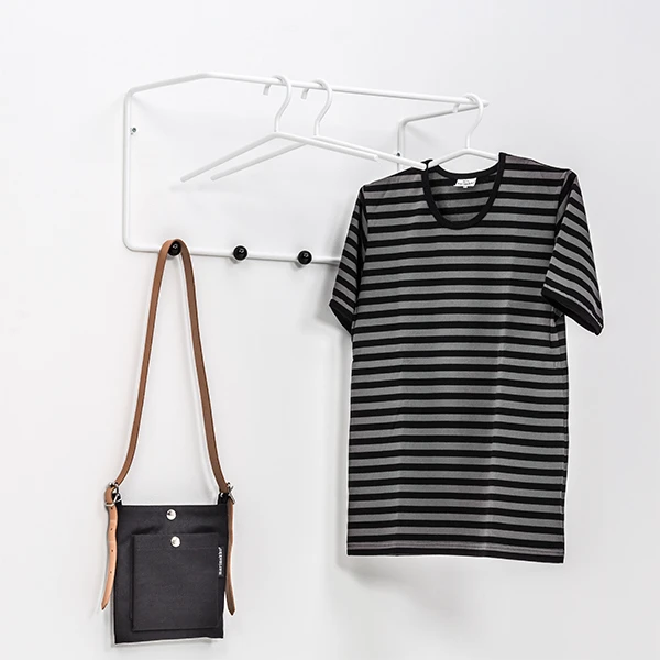 Showroom Finlandin Mixrack-naulakko on minimalismia parhaimmillaan, sillä se rakentuu yksinkertaisesta, valkoiseksi maalatusta teräskehikosta, joka täyttää tehtävänsä ja sopii monenlaisiin eteisiin. M-koon naulakossa on tanko vaateripustimille sekä neljä mustaa, pyöreää nuppia takkien ja laukkujen ripustamista varten.